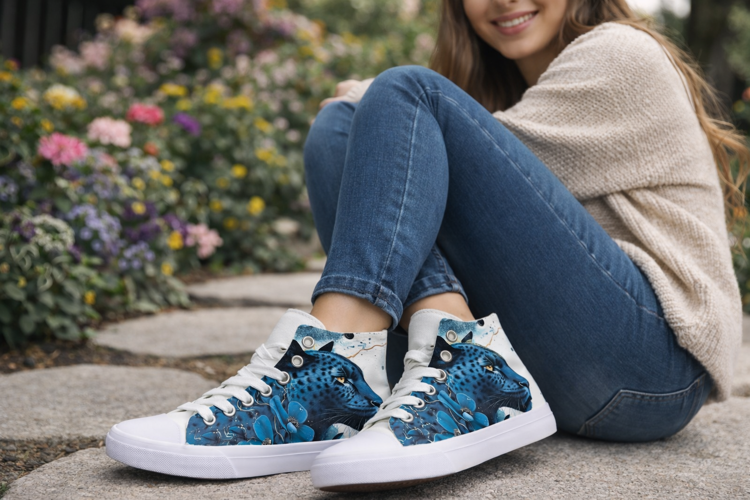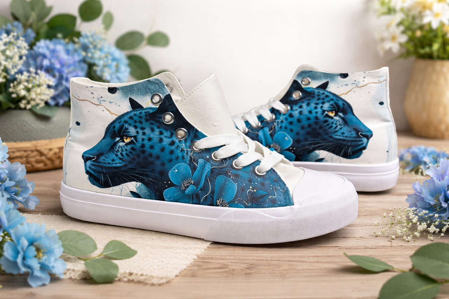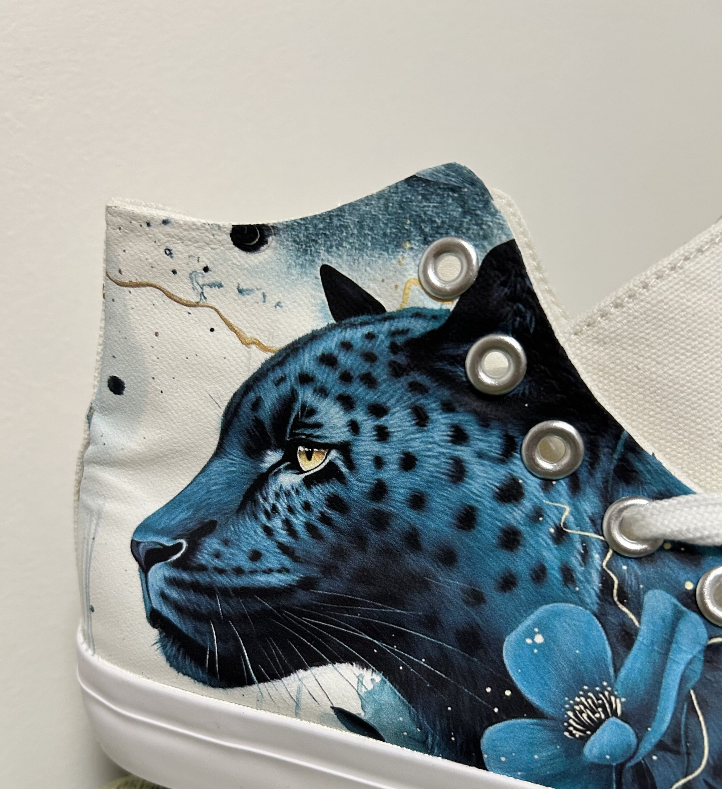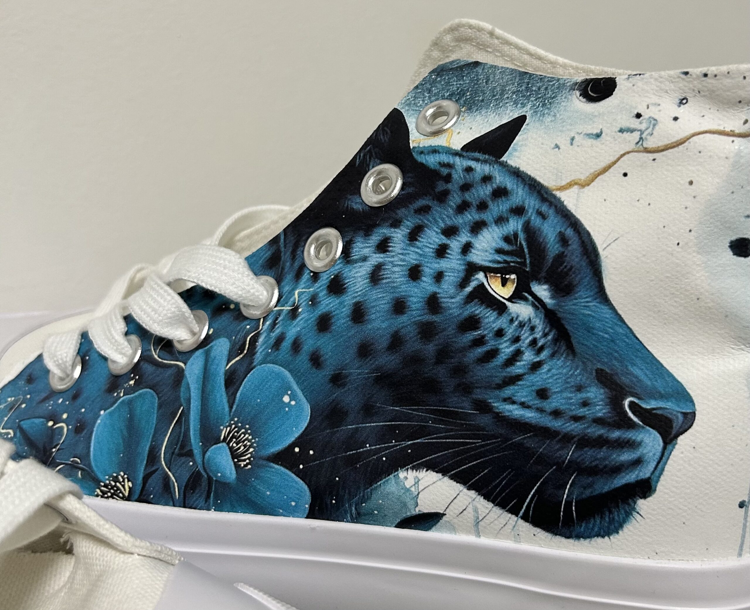 Stylové bílé kotníkové boty s autorským potiskem z vnější strany. Motiv modrého leoparda s květy působí výrazně, ale zároveň elegantně. Boty jsou ideální jako originální doplněk k běžnému nošení.