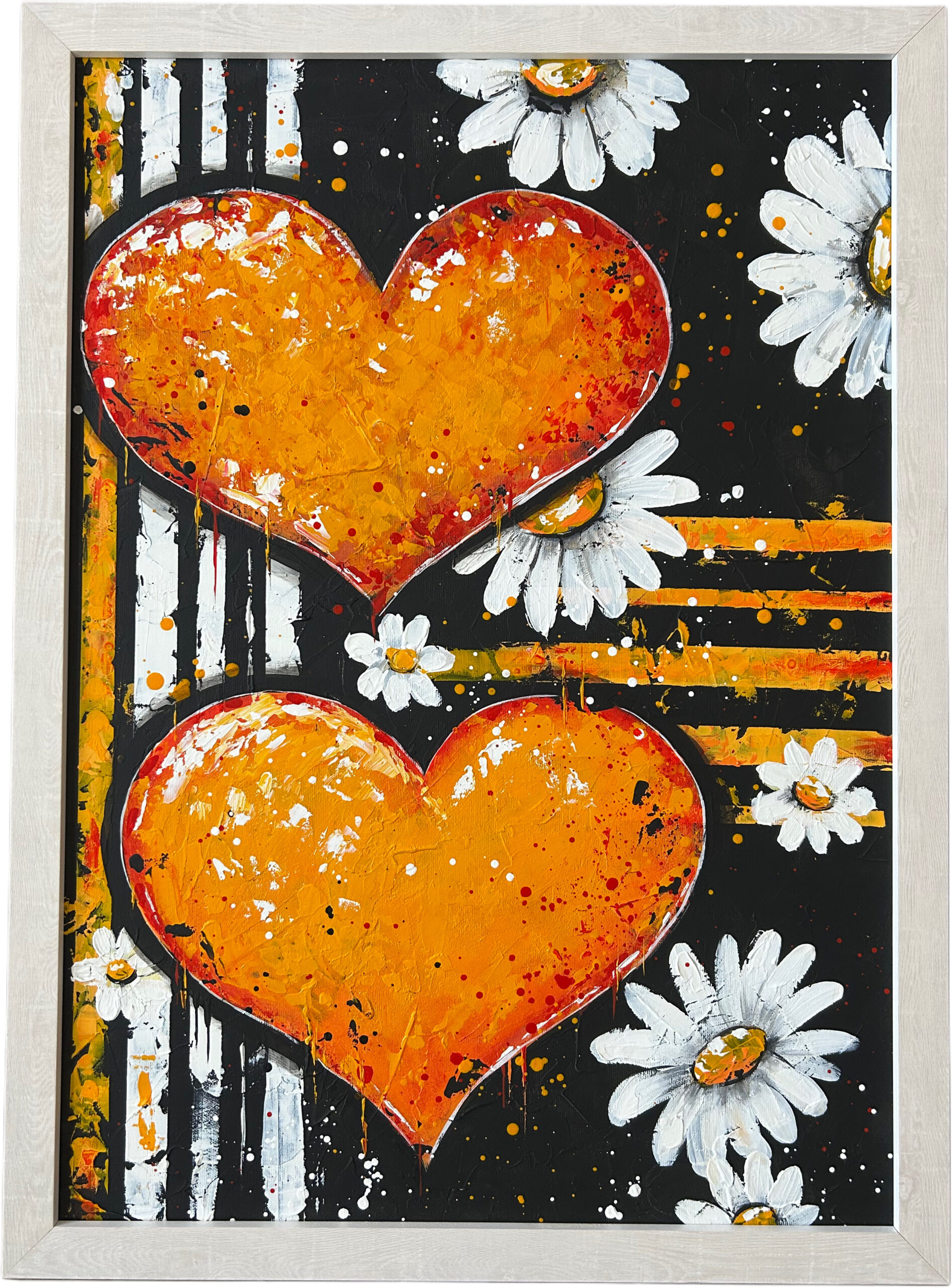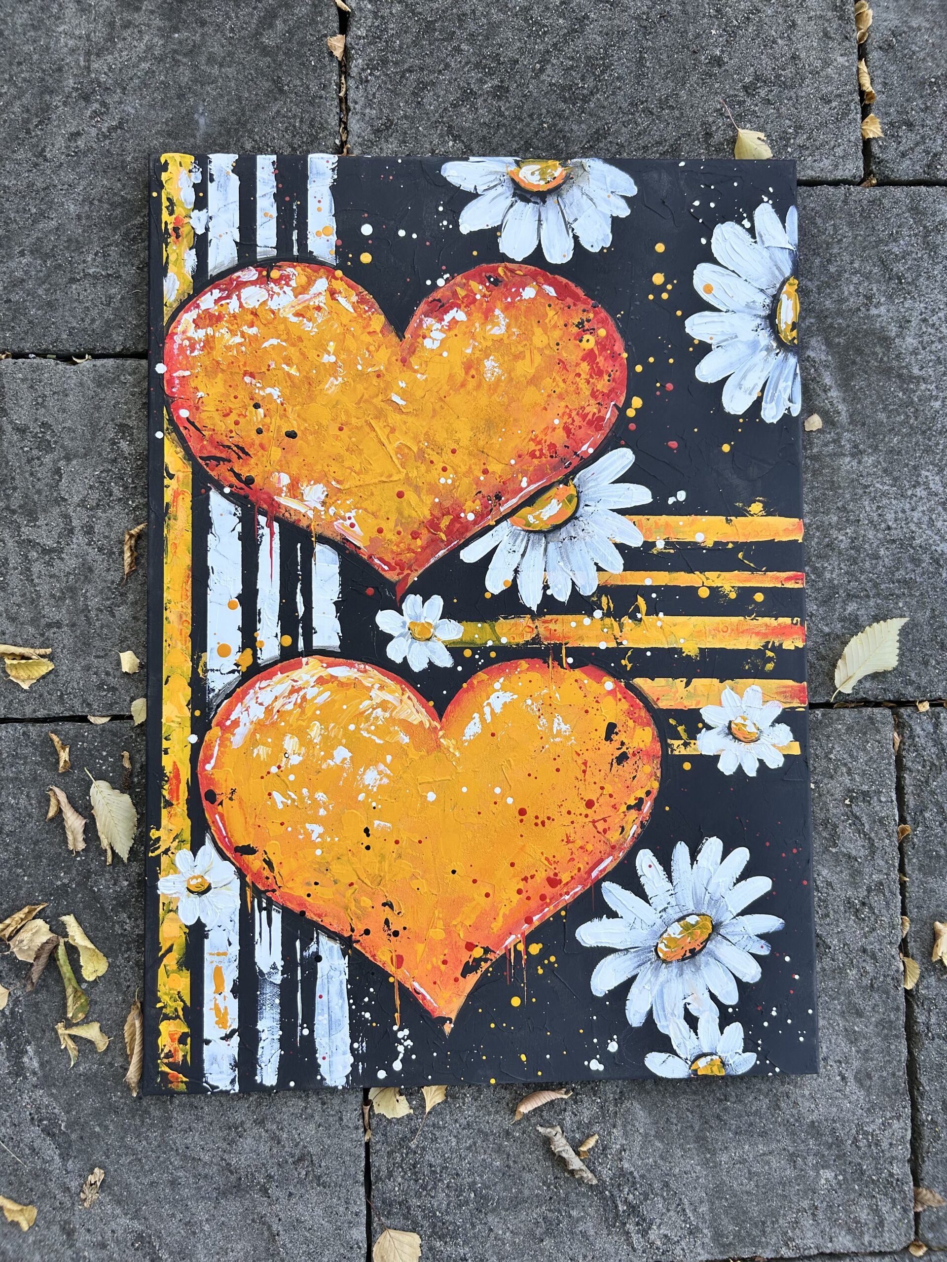 Obraz Dvě srdce a kopretiny je oslavou lásky, radosti a života. Dvě srdce, zářící v teplých oranžovo-zlatých tónech, symbolizují spojení dvou duší, které se navzájem doplňují a rozkvétají.