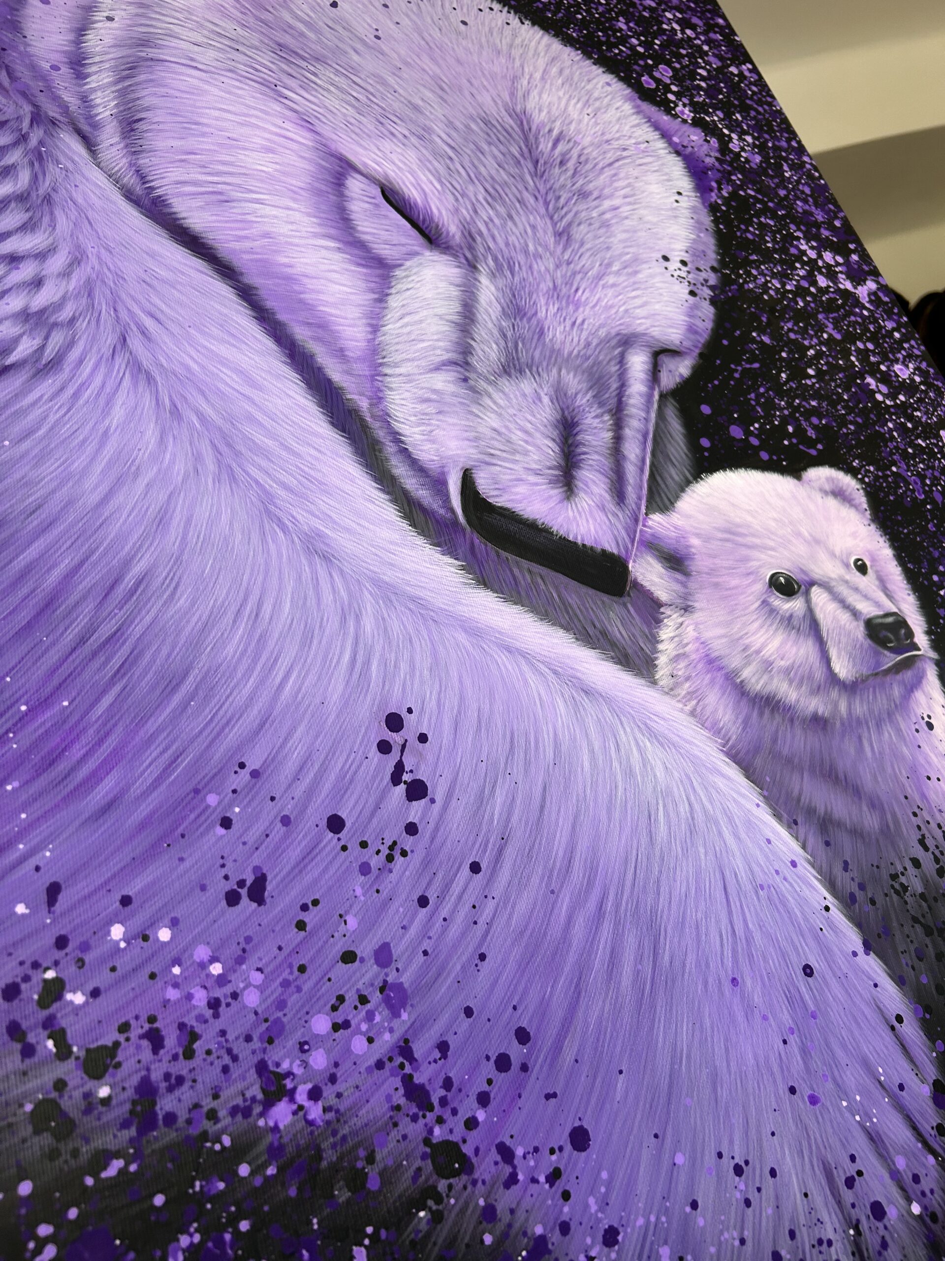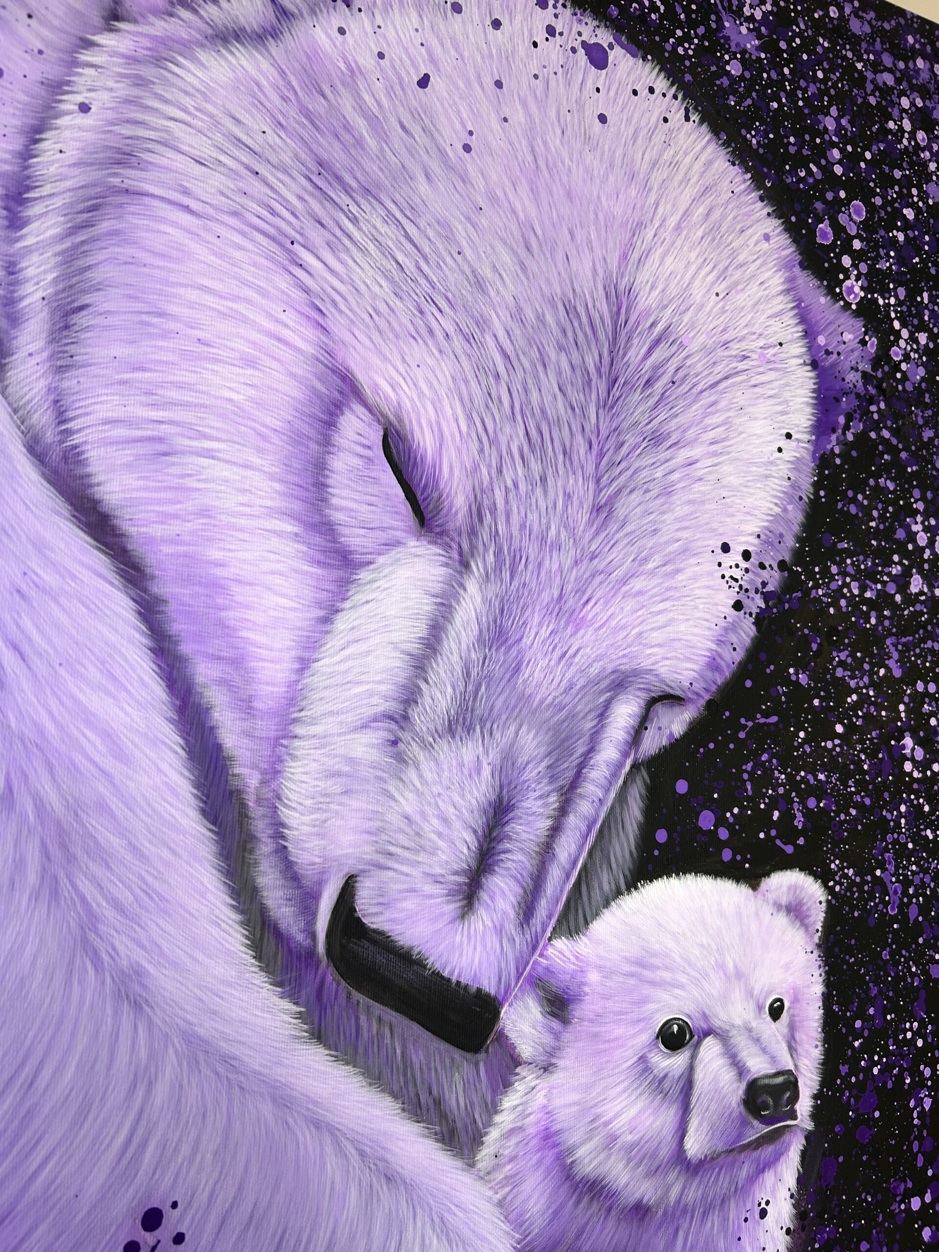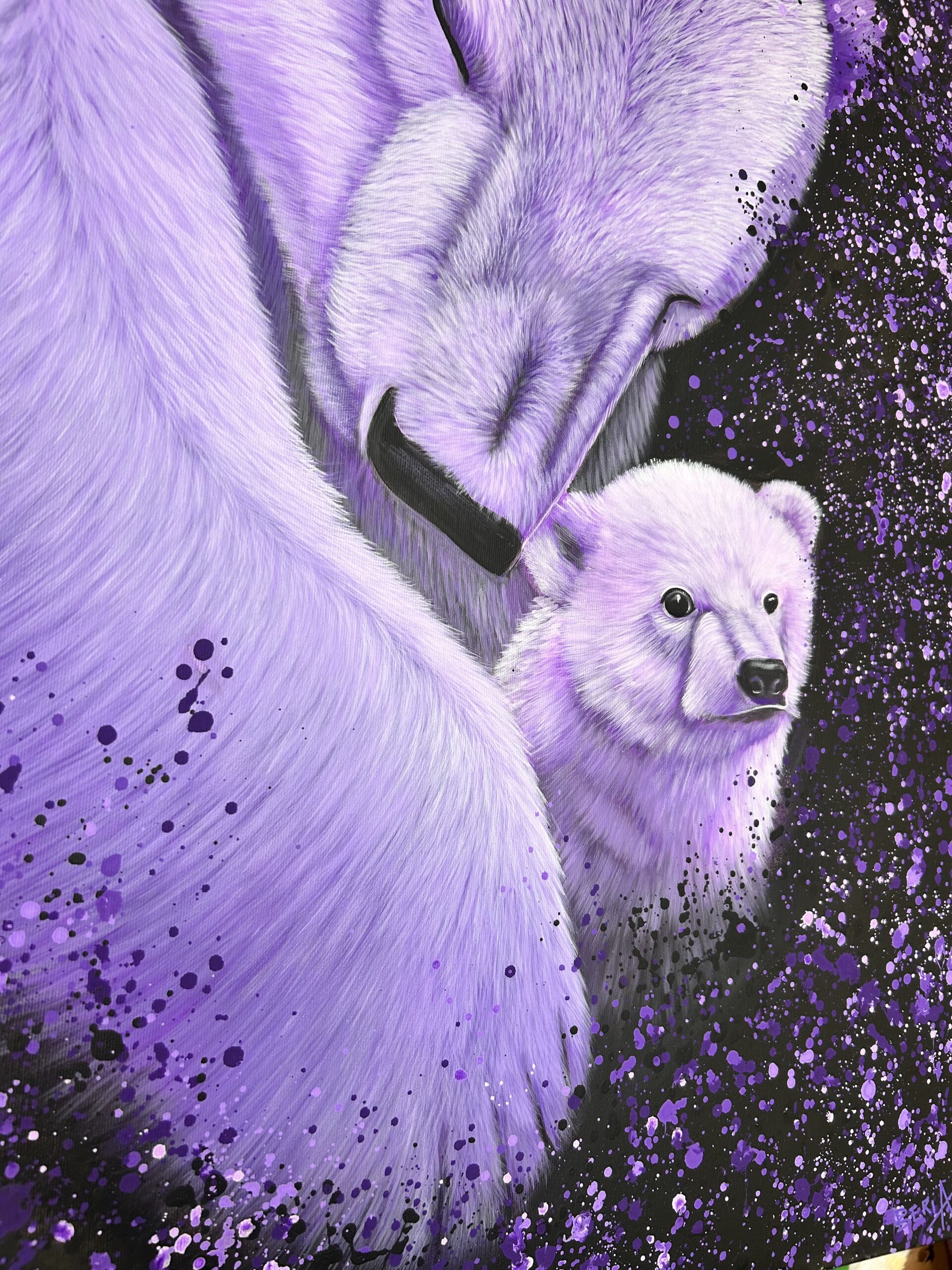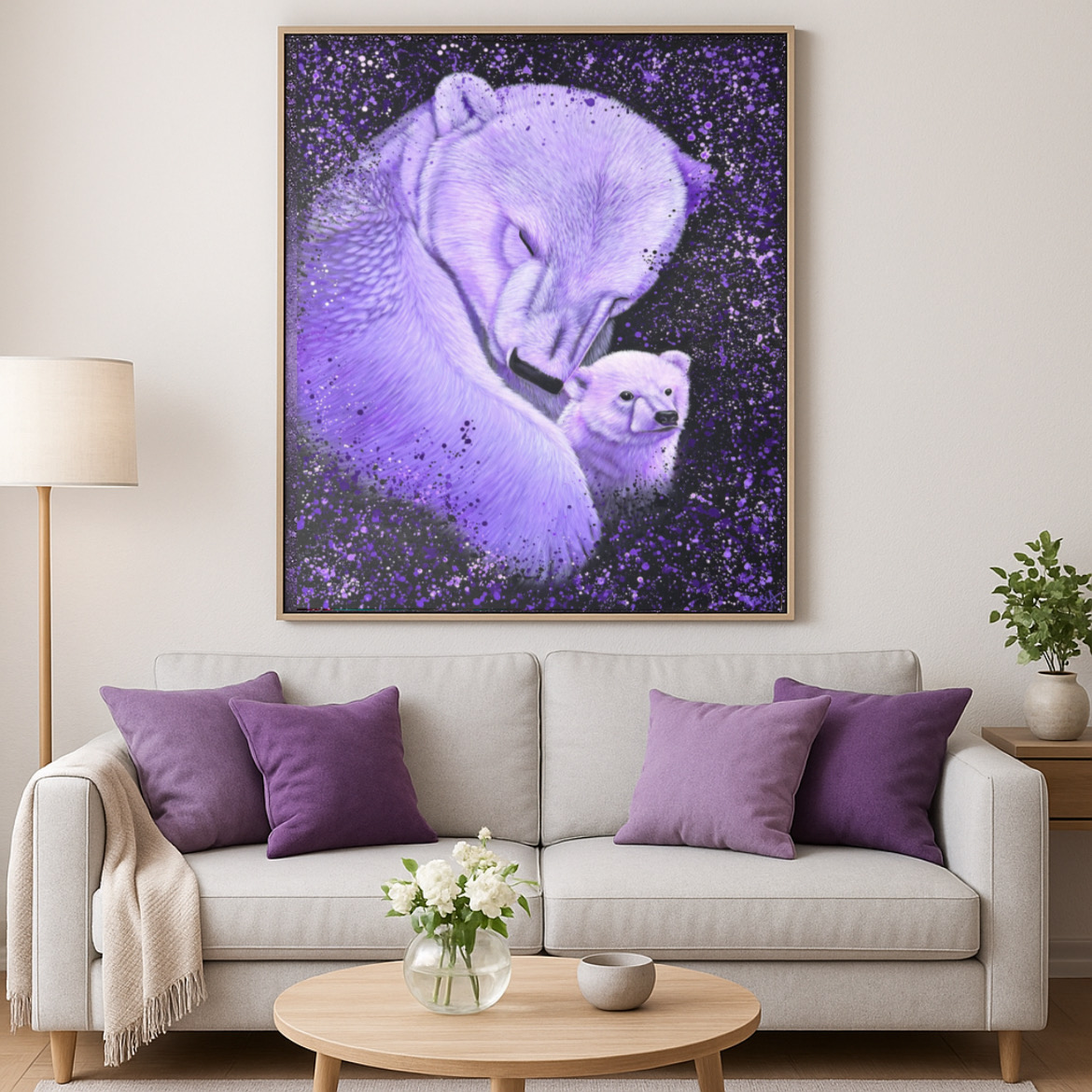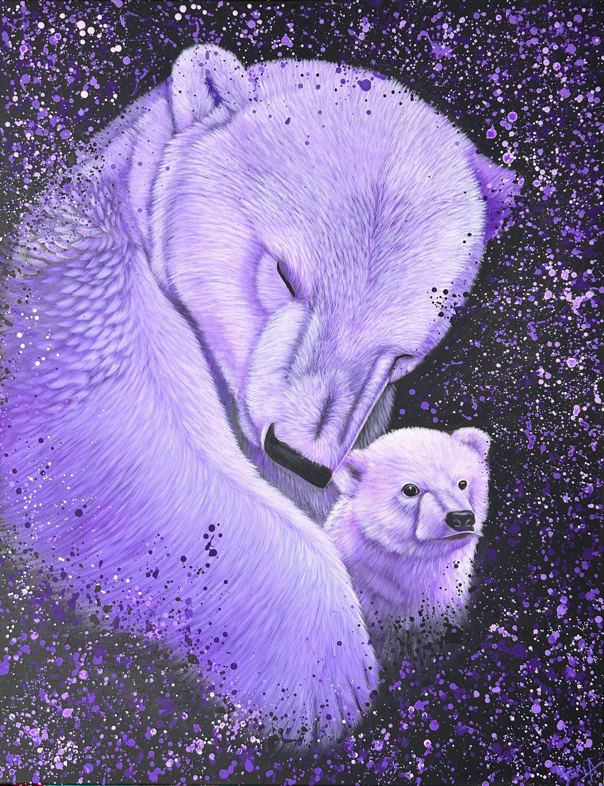 V náruči lední medvědice nachází mládě bezpečí, teplo a klid. Fialové tóny symbolizují ochranu, něhu a duchovní propojení mezi duší matky a dítěte. Obraz nese poselství o síle lásky, která chrání i v těch nejchladnějších chvílích života.