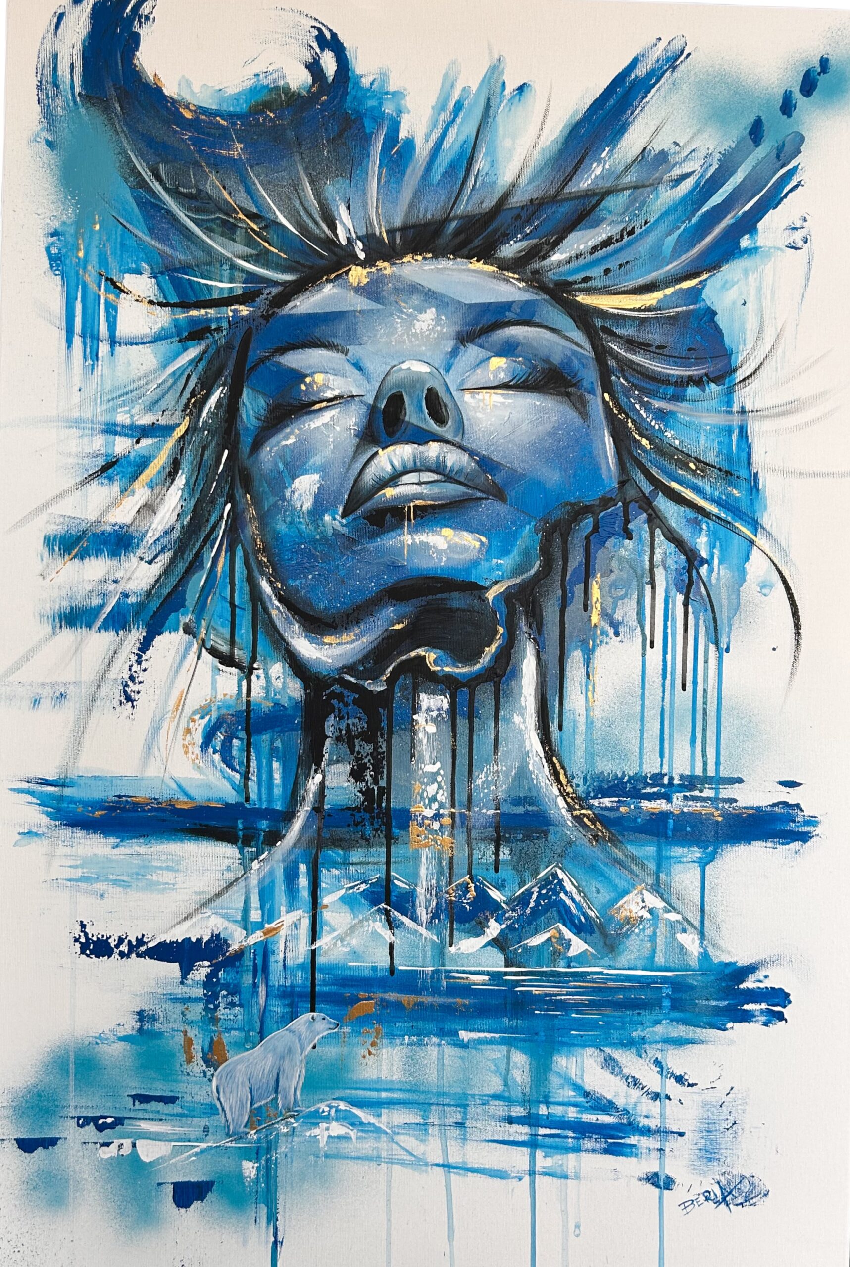 Dynamické tahy štětcem a stékající barvy vyjadřují pohyb emocí, které mohou volně proudit, aniž by nás zahlcovaly. Zlaté akcenty dodávají obrazu jemný nádech naděje, světla a vnitřní síly – i v hloubce klidu je přítomna energie a život.
