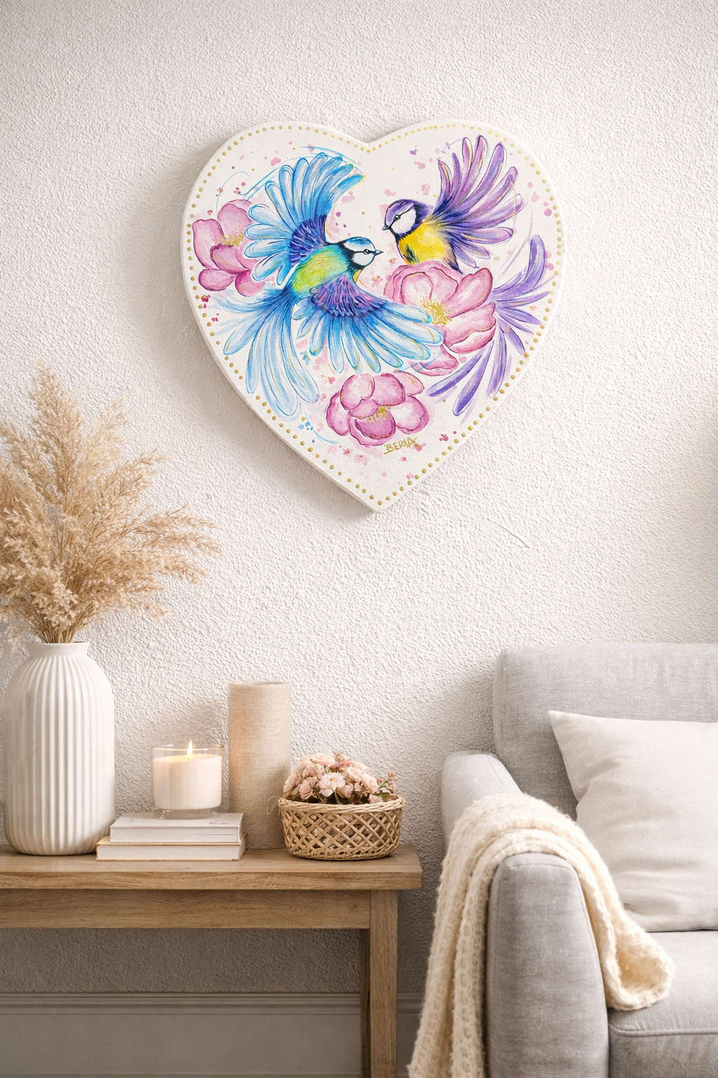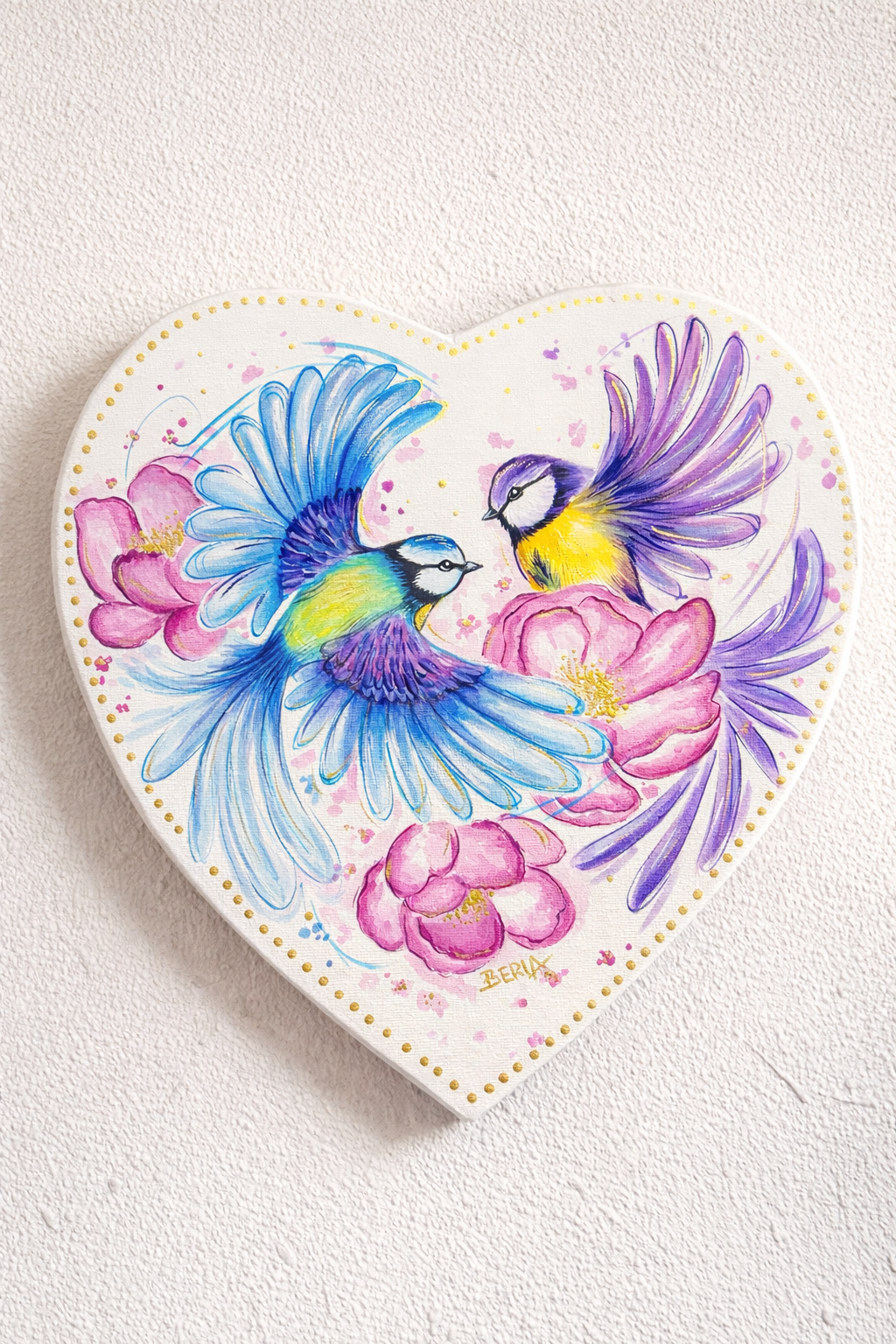Tento ručně malovaný obraz ve tvaru srdce je symbolem lásky, harmonie a něžného spojení. Dva ptáčci v pohybu, obklopení jemnými květy, vytvářejí pocit blízkosti, radosti a klidu. Každý tah štětce je malovaný s citem a lehkostí, díky čemuž obraz působí živě a pozitivně.